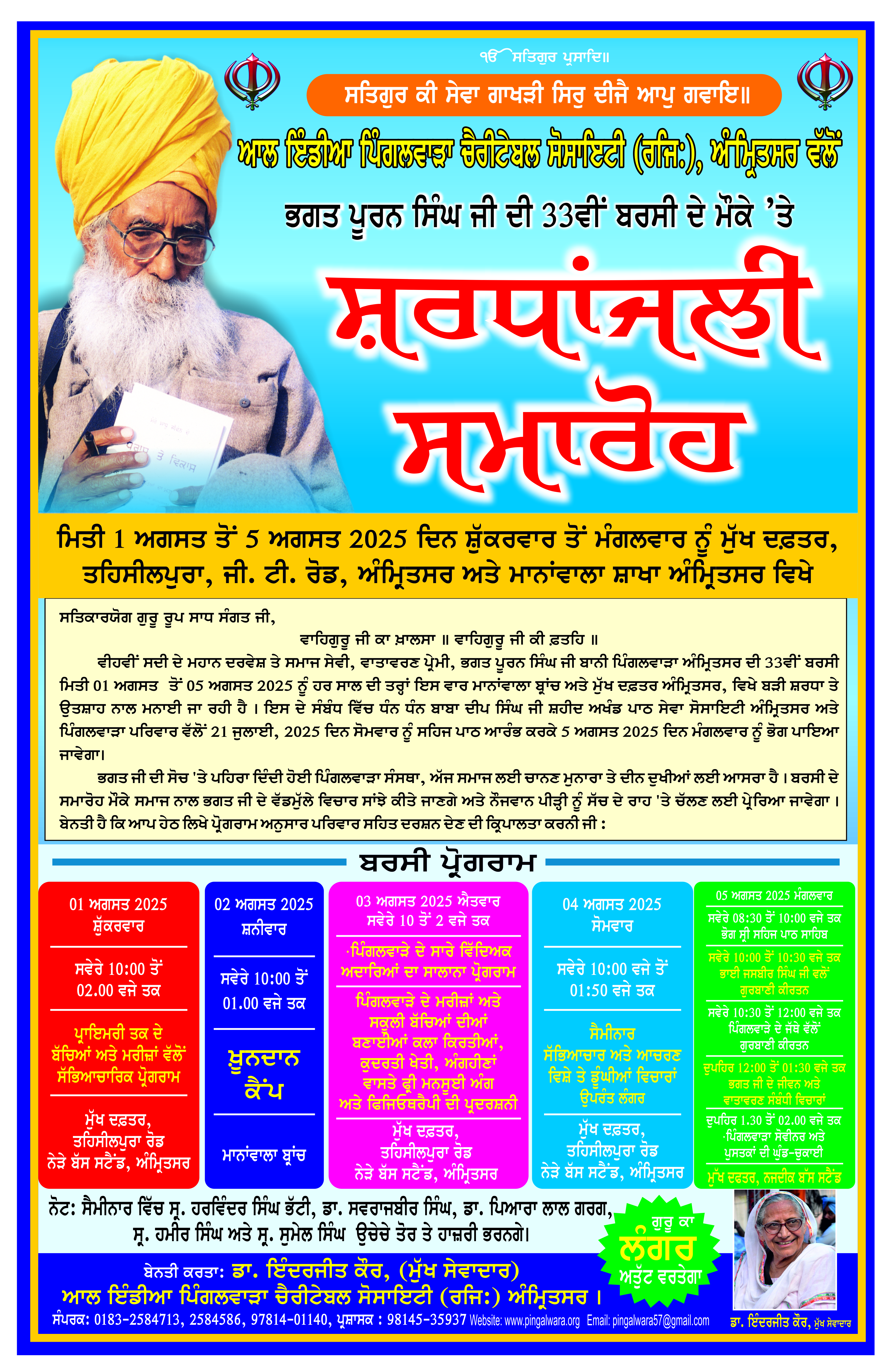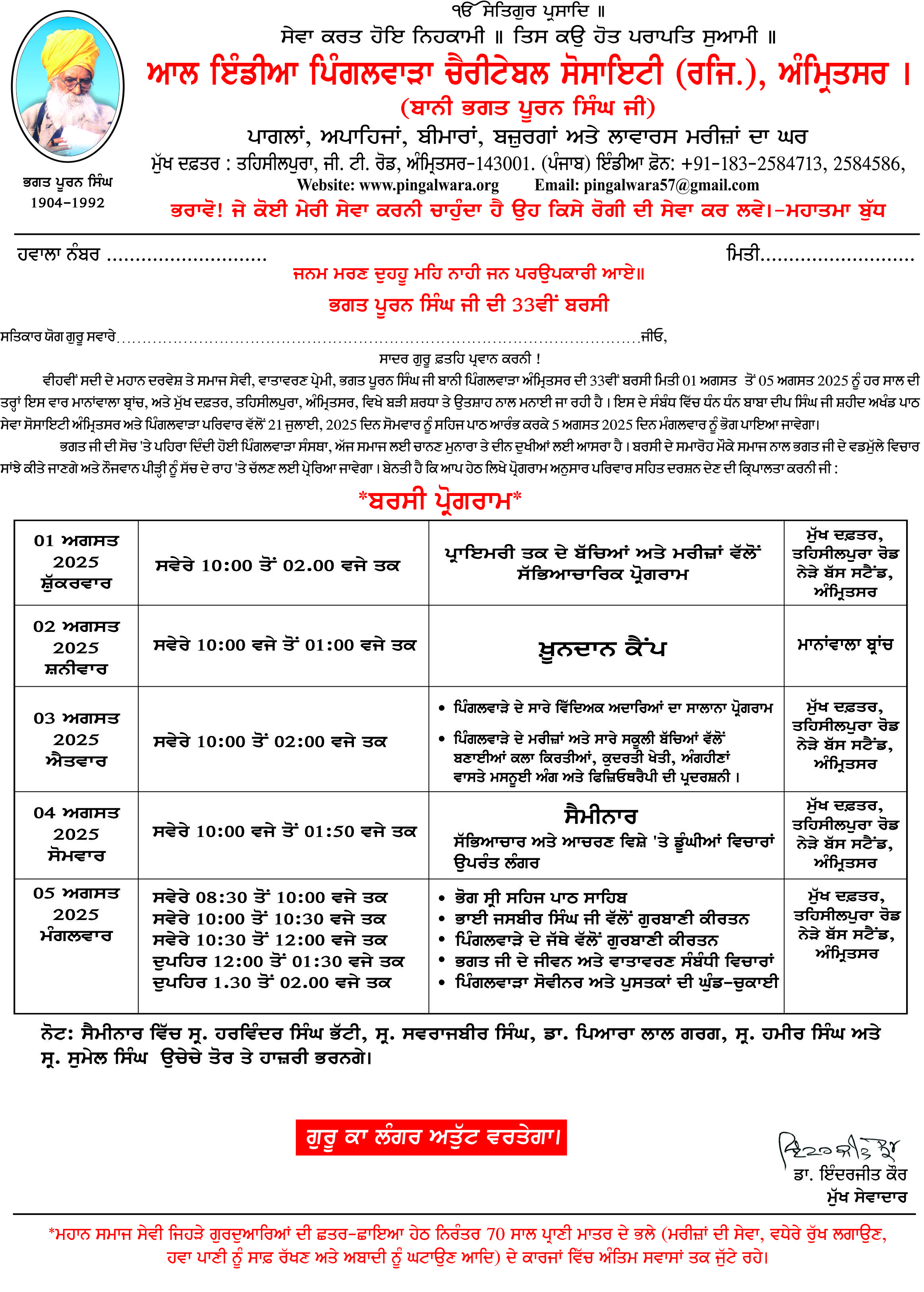 Posted byPingalwara July 30, 2025 0 Share: Related Articles Eh janam tumhare lekhe Bhagat Puran Singh Adarsh Sen Sec. School VISIT BY ANDREW SCHEER LEADER OF OPPOSITION CANADA Kultar Singh Sandhwan, Speaker Vidhan Sabha Visited at Pingalwara A Tribute Through Humanity: 120 Units Donated in Blood Camp at Pingalwara Manawala Honoring Humanity: Blood Donation Drive on Bhagat Ji’s Barsi – 2nd August