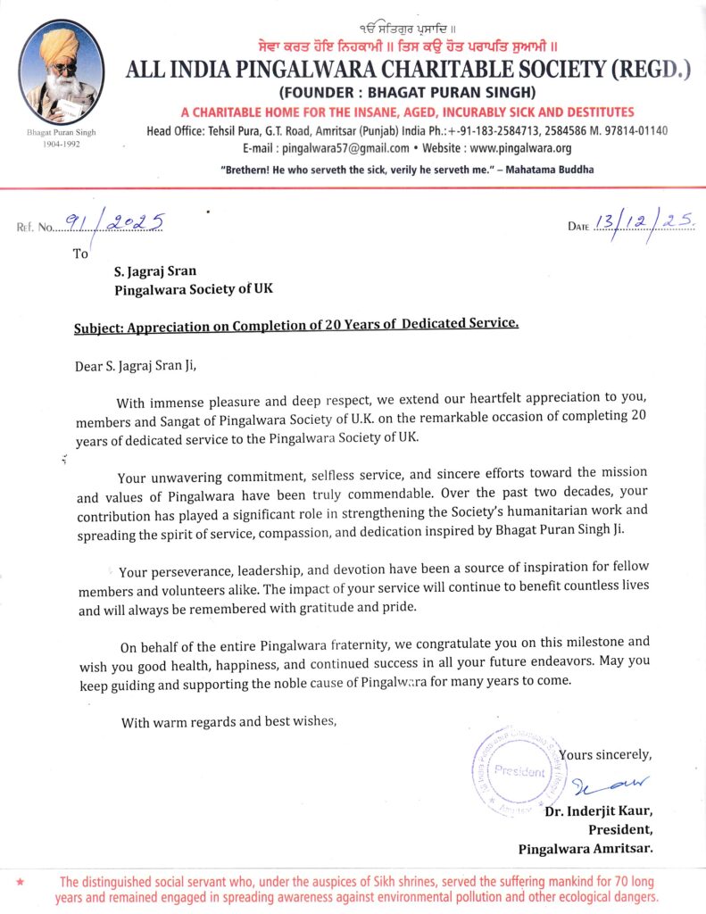 With immense pleasure and deep respect, we extend our heartfelt appreciation to you, members and Sangat of Pingalwara Society of U.K. on the remarkable occasion of completing 20 years of dedicated service to the Pingalwara Society of UK.